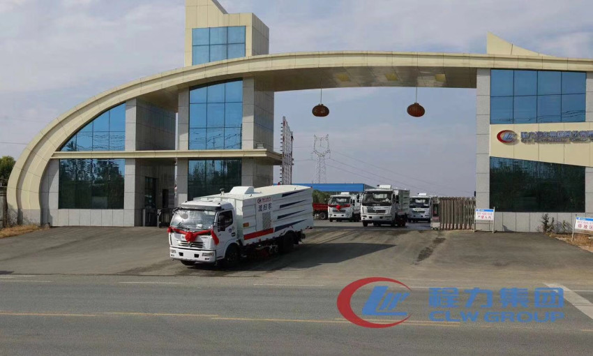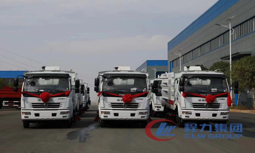 秋日的暖阳下,整齐排一的东风大多利卡洗扫车和人行道路面养护车熠熠生辉,威风凌凌的排列在气势宏伟的程力公司门口。