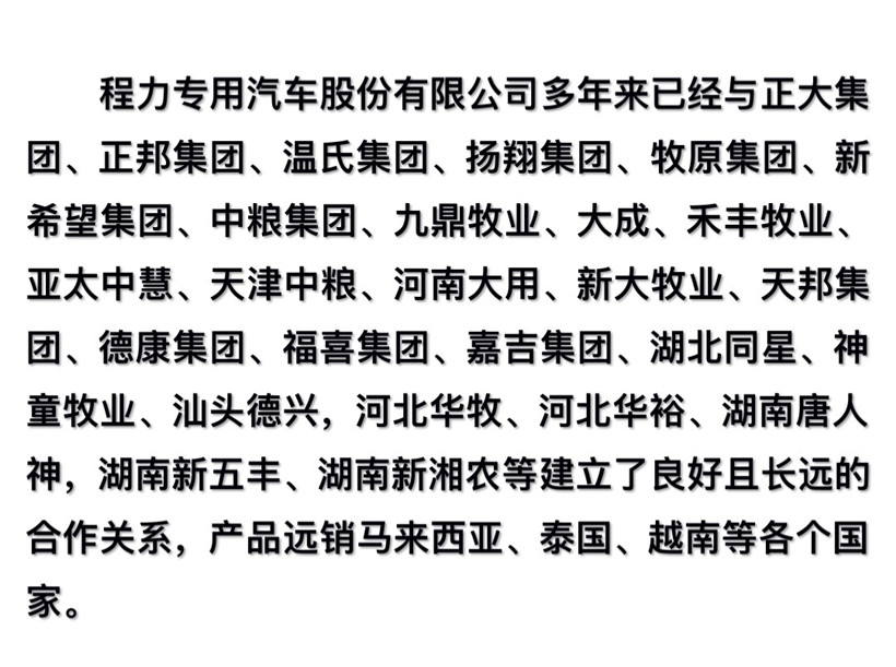 2013年,程力专用汽车股份有限公司占地500亩,在册员工2000余人,产销各类专用车10000余台,产值10亿元,外贸出口8500万元,上缴国家税收2000万元。