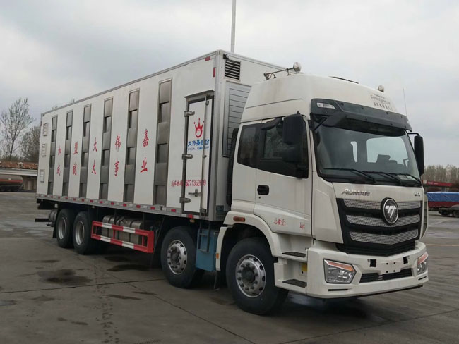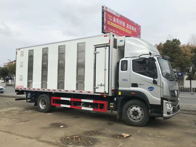 3. 恒温系统:由车载制冷机,暖风机,气体混合输送仓,排风扇等组成,实现仔猪生存空间气体的流通和恒温.为保证运输过程中对温度的控制,畜禽运输车采用双系统制冷空调,且箱体两侧设计三排带电动排气扇的通风口和百叶窗,夏季通过空调实现箱内降温.为解决冬季畜禽运输采暖,采用独立的水暖系统,采用智能巡检仪,保证车厢内恒温28-32℃,在驾驶室就能实时监测箱内的温度变化,便于控制温度。