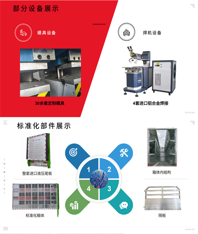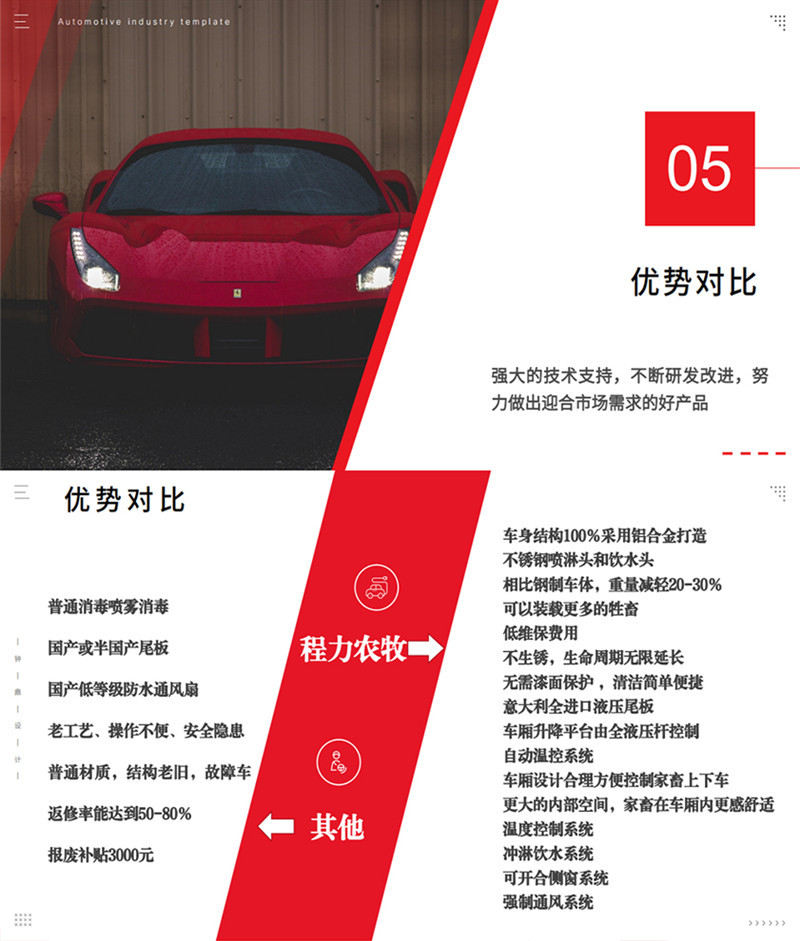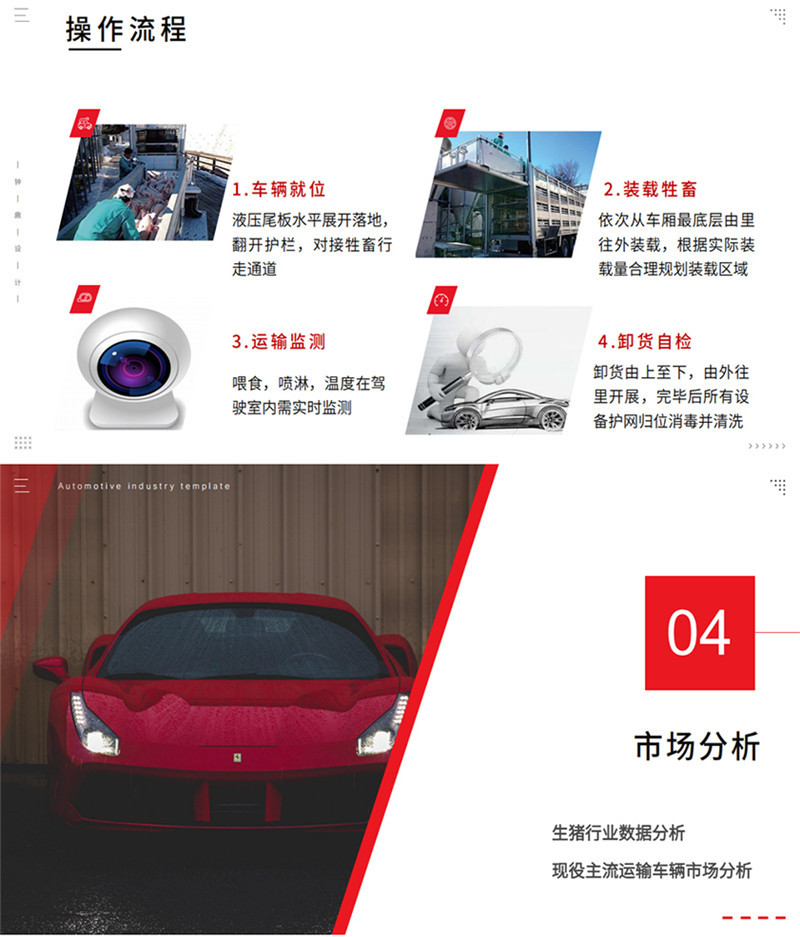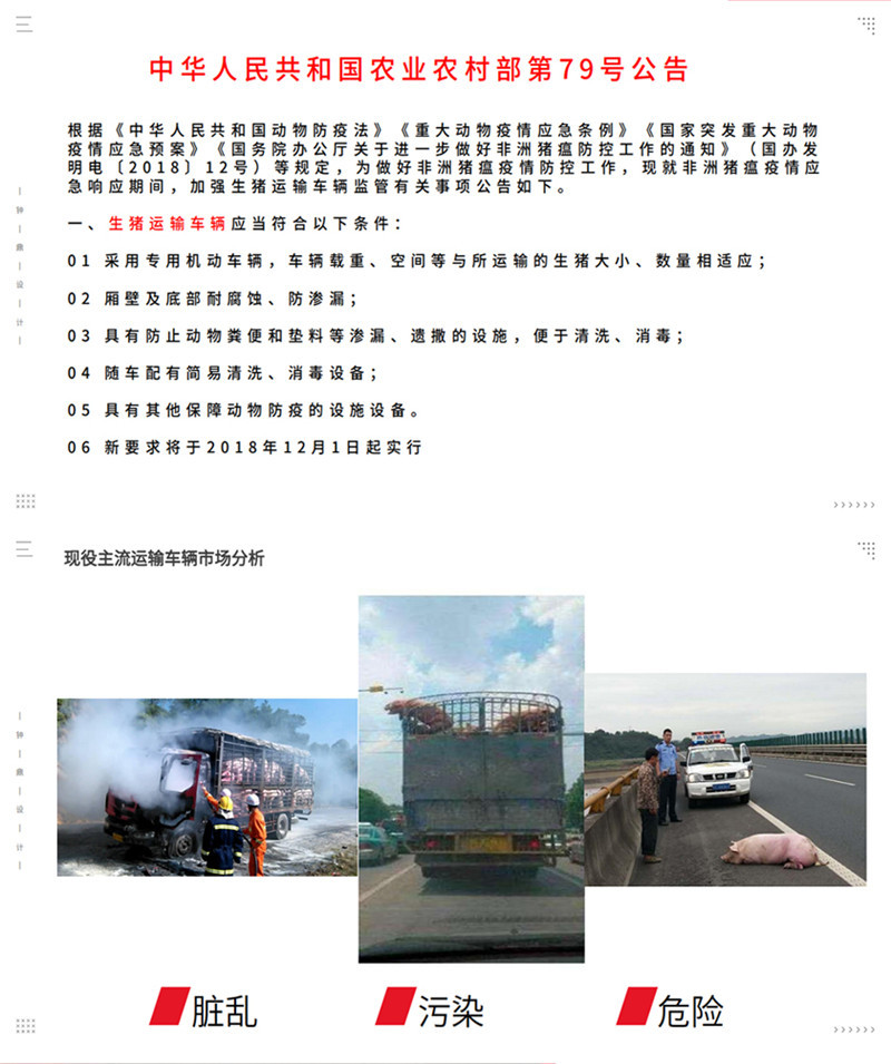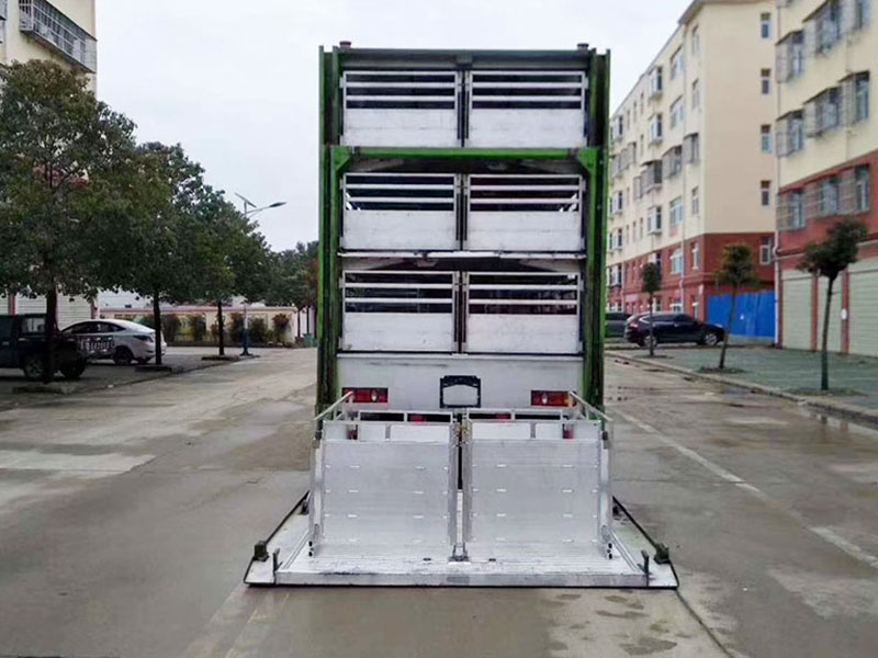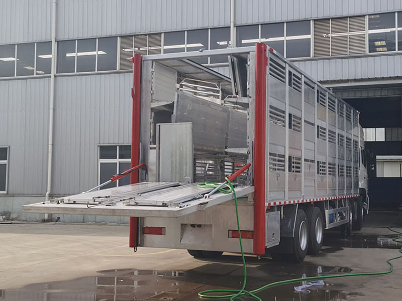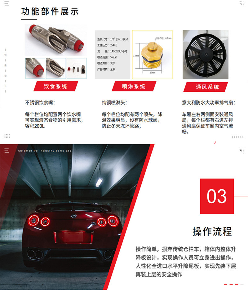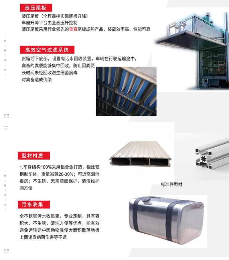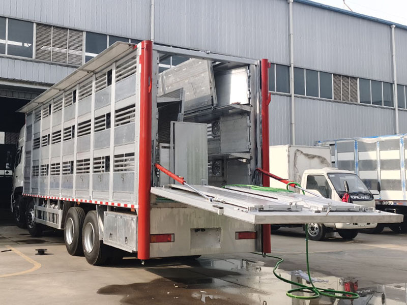 专用配置 | 1,装载面积:车厢三层,单层面积21平方,三层共计63平方; 2,隔板层高:车厢三层,层高850mm; 3,栏位面积:车厢三层,每层3个栏位,每个栏位7平方; 4,喷淋喷头:每个栏位配2个雾化喷头,整车共计18个喷头; 5,饮水水咀:每个栏位配2个自饮水式水咀,整车共计18个水咀; 6,照明灯;每层一个照明灯,尾部一个照明灯; 7,摄像头:每层一个摄像头,车尾一个摄像头; 8,温度监控:温度探头3个; 9,空气循环排气扇:每层4个,共计12个; 10,车厢内隔全为耐腐蚀防滑铝合金型材,中部可翻起; 11,净水箱,污水箱; 12,空调:降温系统; 13,上猪平台:垂直升降液压尾板。 |