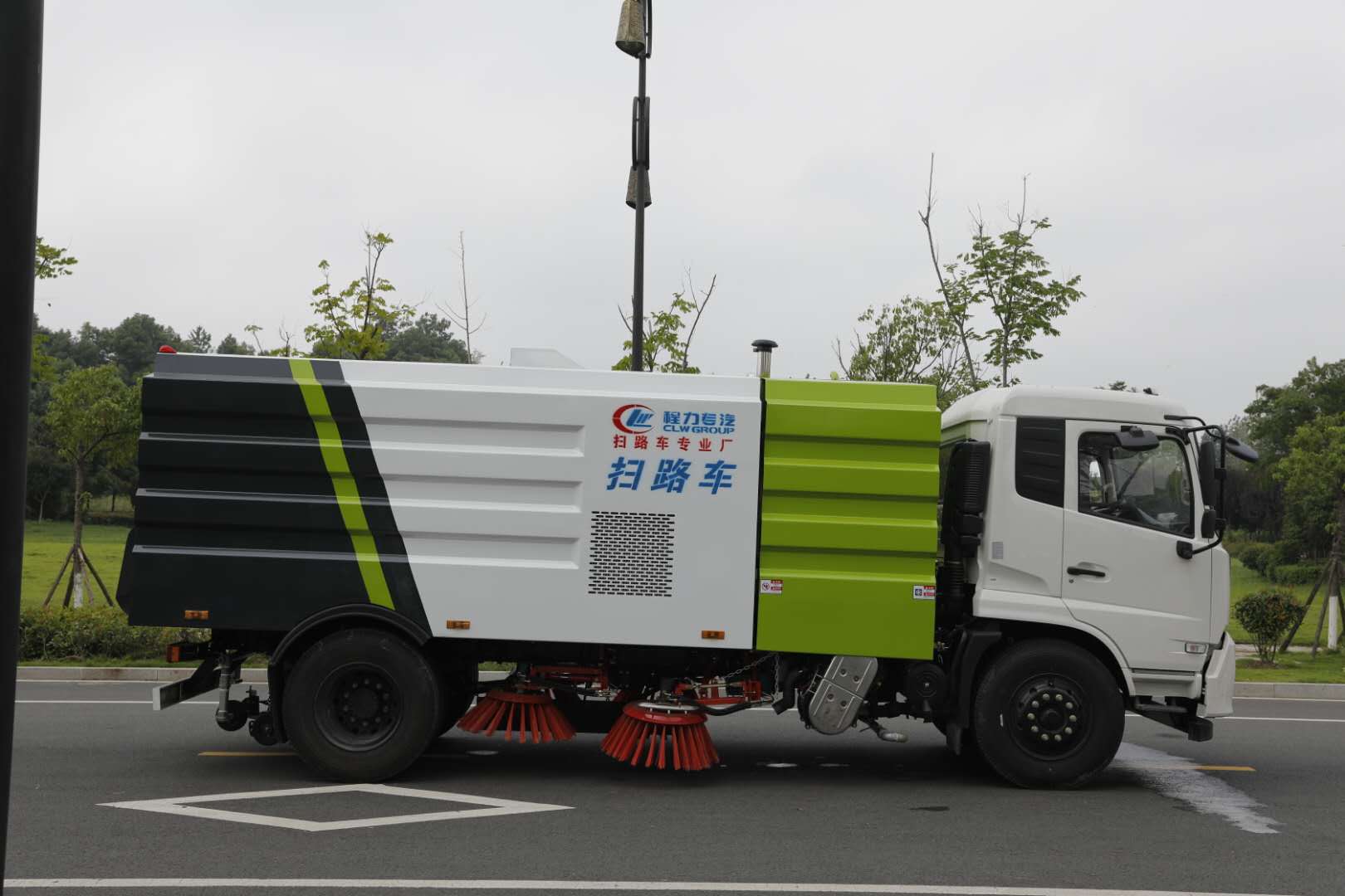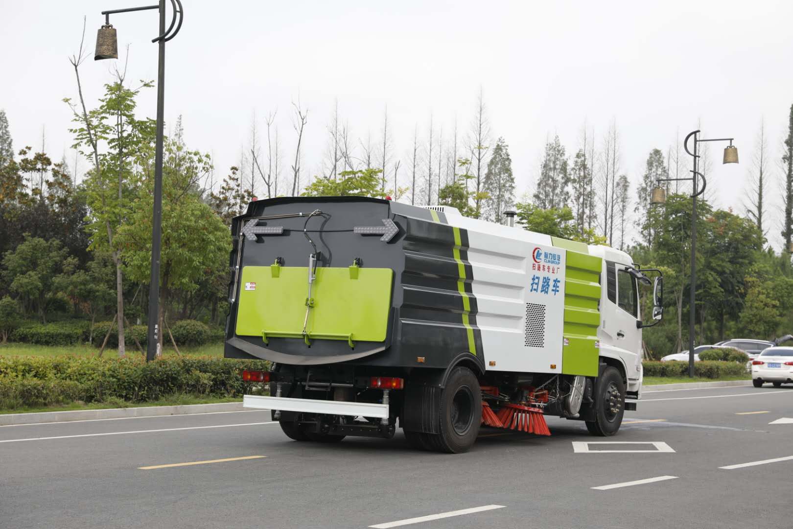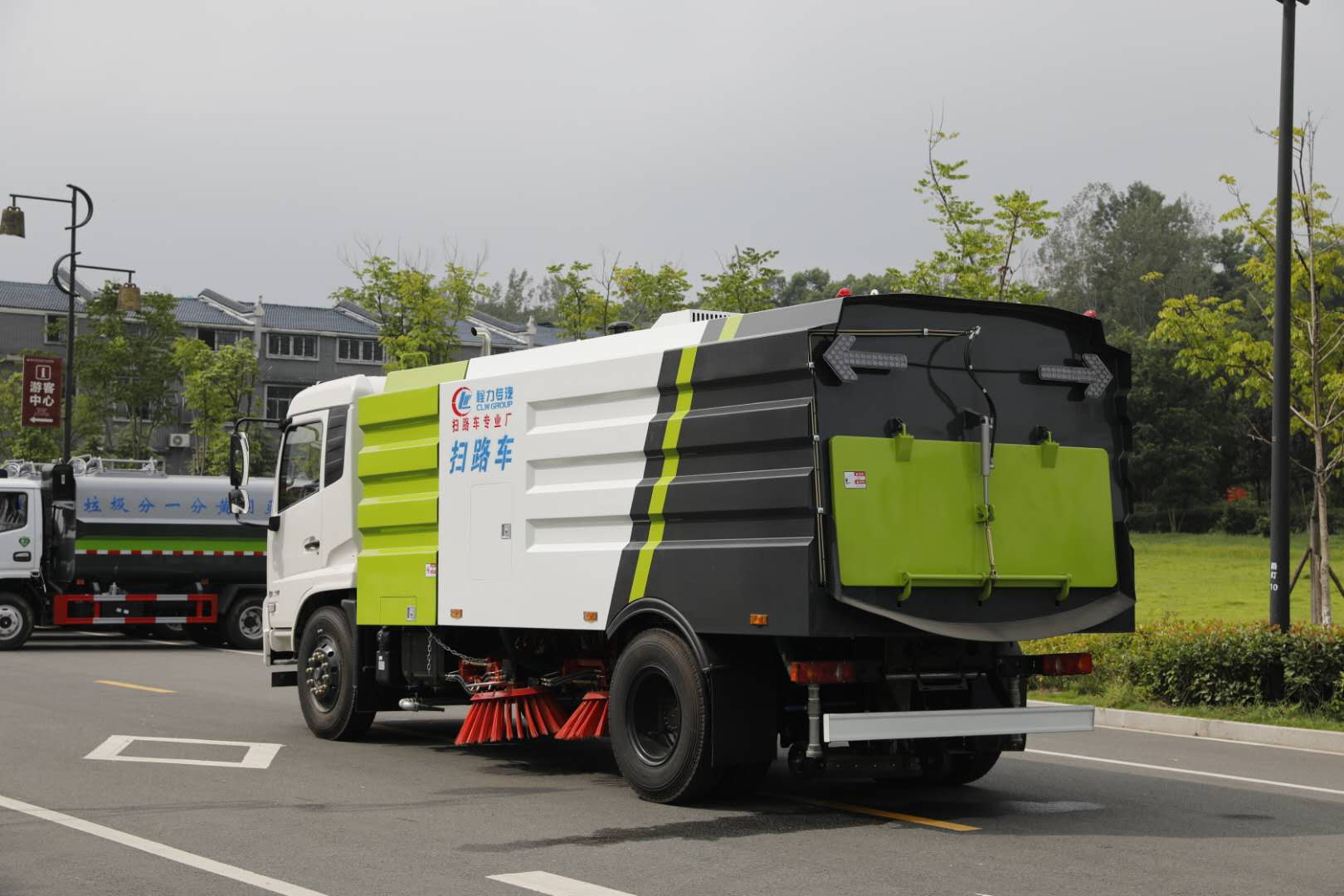 2、扫路车采用吸扫结合的方式收集垃圾,湿式除尘、电液控制,液压倾翻卸料的作业方式对路面进行清扫作业。