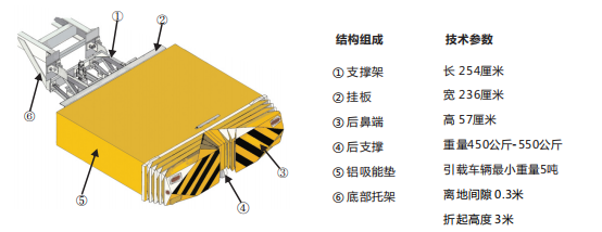 该防撞缓冲车上装部分主要由货箱总成、诱导组合灯、防撞缓冲模块、液压系统和电气系统组成,通过油路控制防撞缓冲模块升降,工作状态下防撞模块处于降落水平状态。